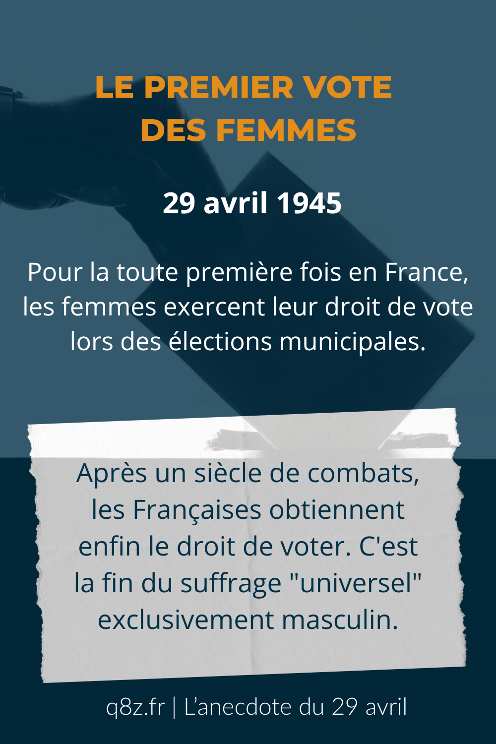 Le 29 avril 1945, la France connaît un tournant démocratique majeur : pour la première fois de l'histoire du pays, les femmes se rendent aux urnes. Ce premier scrutin, des élections municipales, marque la fin d'une exception française qui durait depuis trop longtemps.